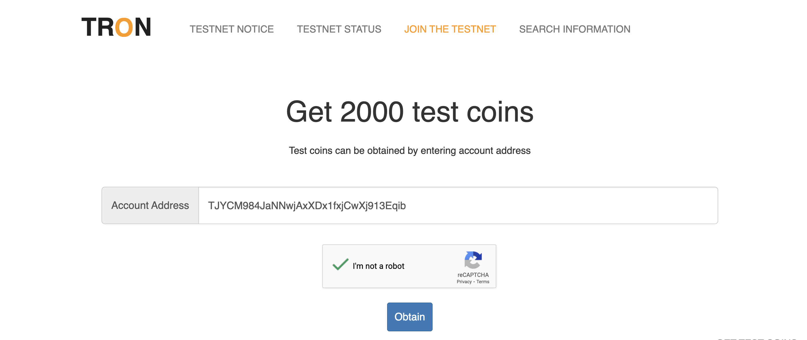 - Go to the Nile Tron page which is a faucet to receive 2000 Test TRON.
