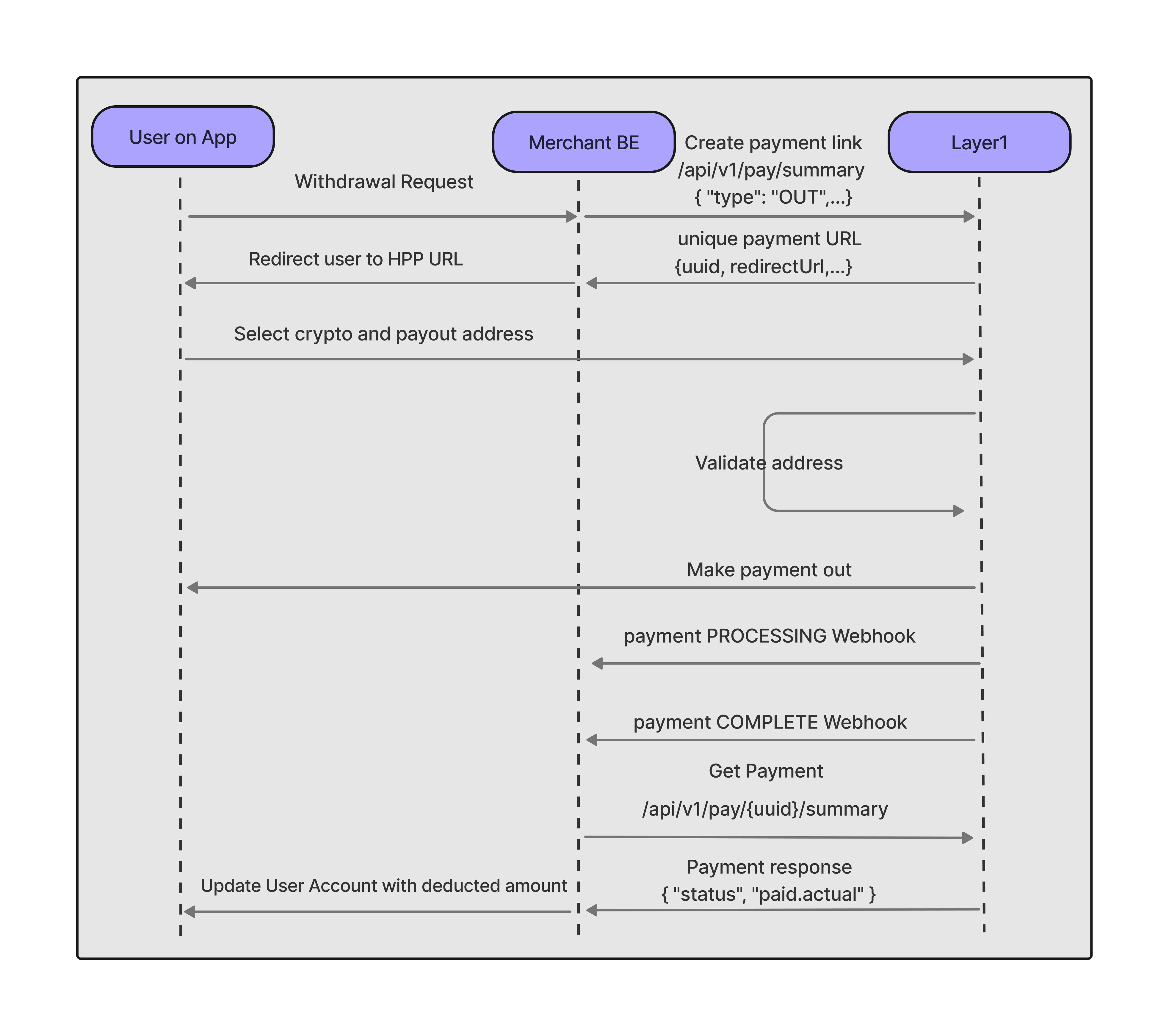 The sequence diagram for a crypto payment in followed in this guide